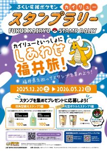 2025年12月20日(土)から2026年3月22日(日)の期間で「カイリューと一緒にしあわせ福井旅 スタンプラリー」を実施しています。スタンプを集めて応募すると抽選でカイリューの限定グッズが当たります。